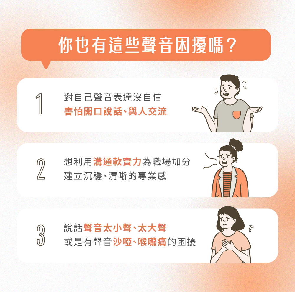 - 改善說話聲音太小、容易喉嚨痛等問題。