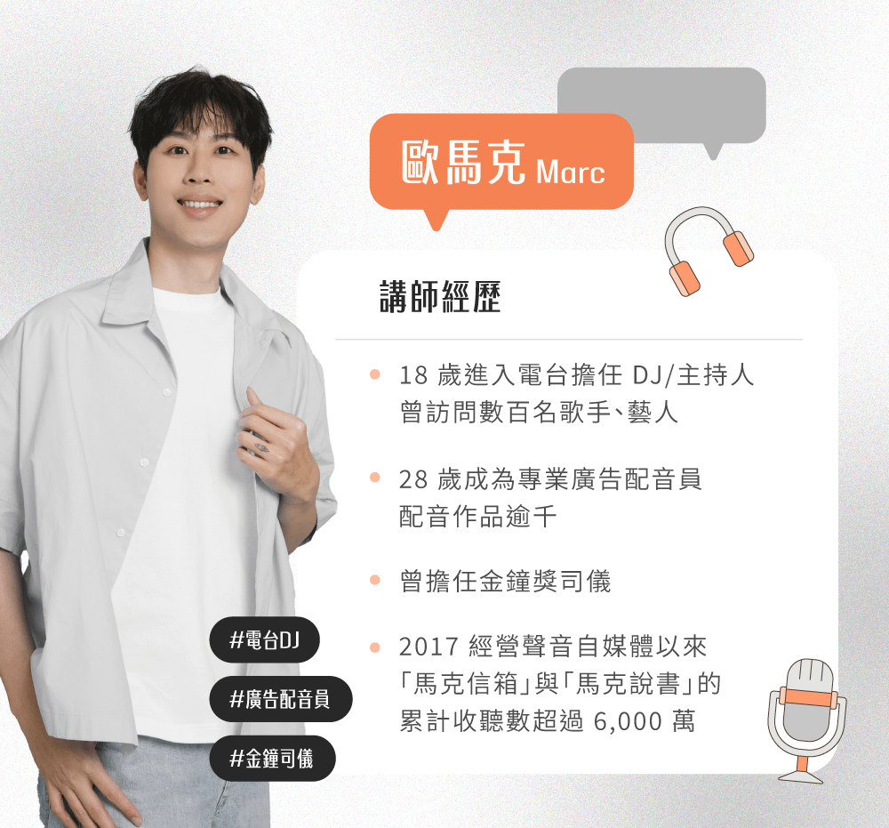 我是一名廣播 DJ,也是一位專業的廣告配音員,我的工作就是每天使用聲音、接觸聲音。聲音是我們與生俱來的能力,但人們卻只發揮不到 10% 的聲音力。