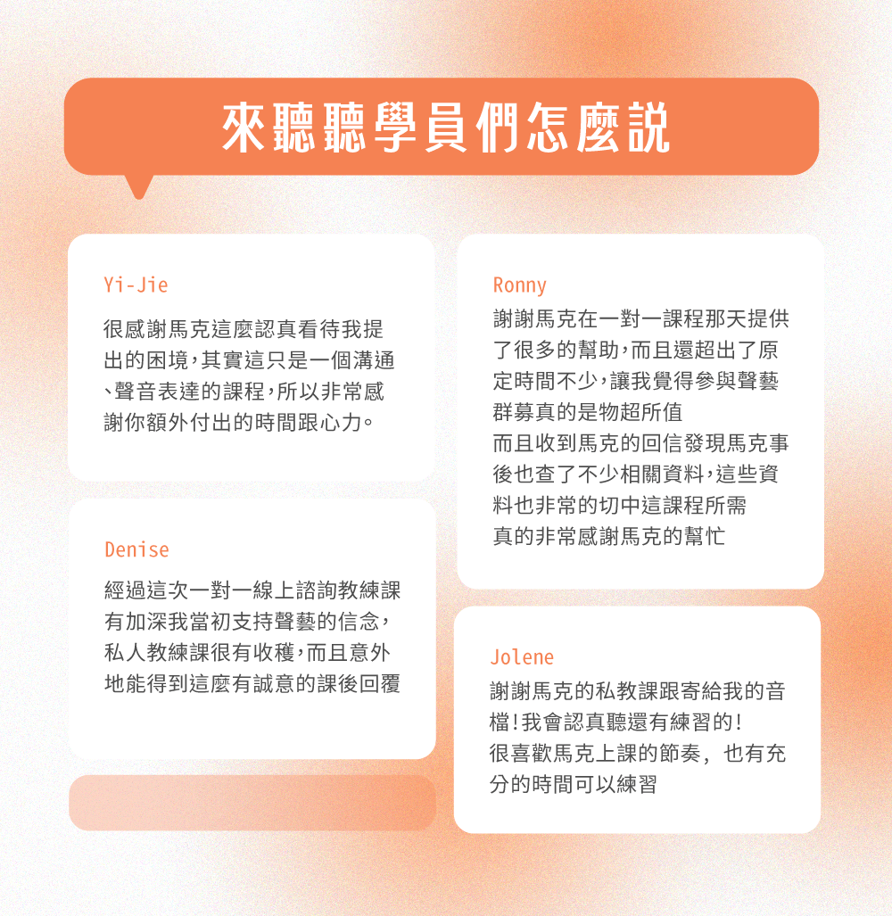 在這堂教練課,我將透過一對一教學協助你,利用二元性的概念找到自己的聲音,並且藉由簡單的反向練習,解決你的說話困擾。